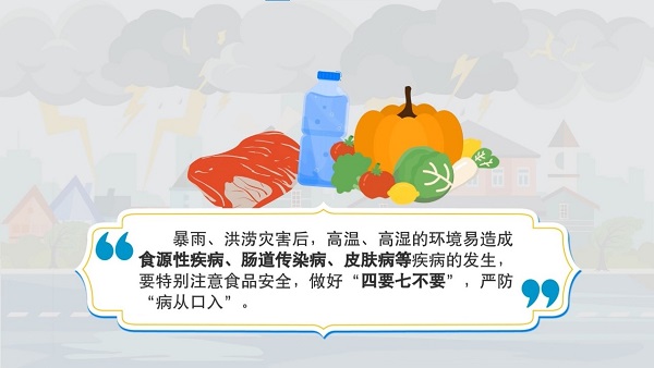 近期,全国多地出现持续性强降水天气。暴雨、洪涝灾害过后,高温、高湿的环境易引起食源性疾病、肠道传染病、皮肤病等疾病,因此,我们需特别注意食品安全,做好以下“四要七不要”,严防“病从口入”。